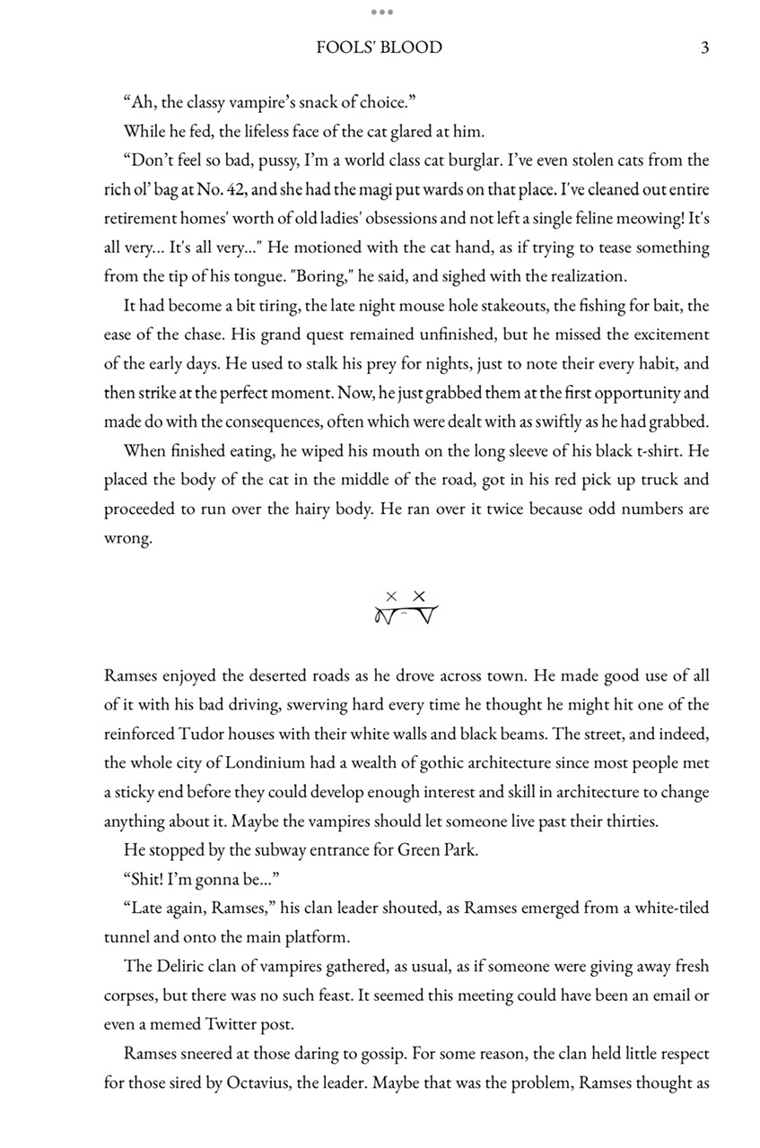 Fools’ Blood is a wacky, witty and weally, weally clever tale of one determined, undead man standing against a world slightly less insane than him. It blends supernatural mythology with comic characters, ridiculous action and hidden twists with jokes that’d be at home in a British sitcom.